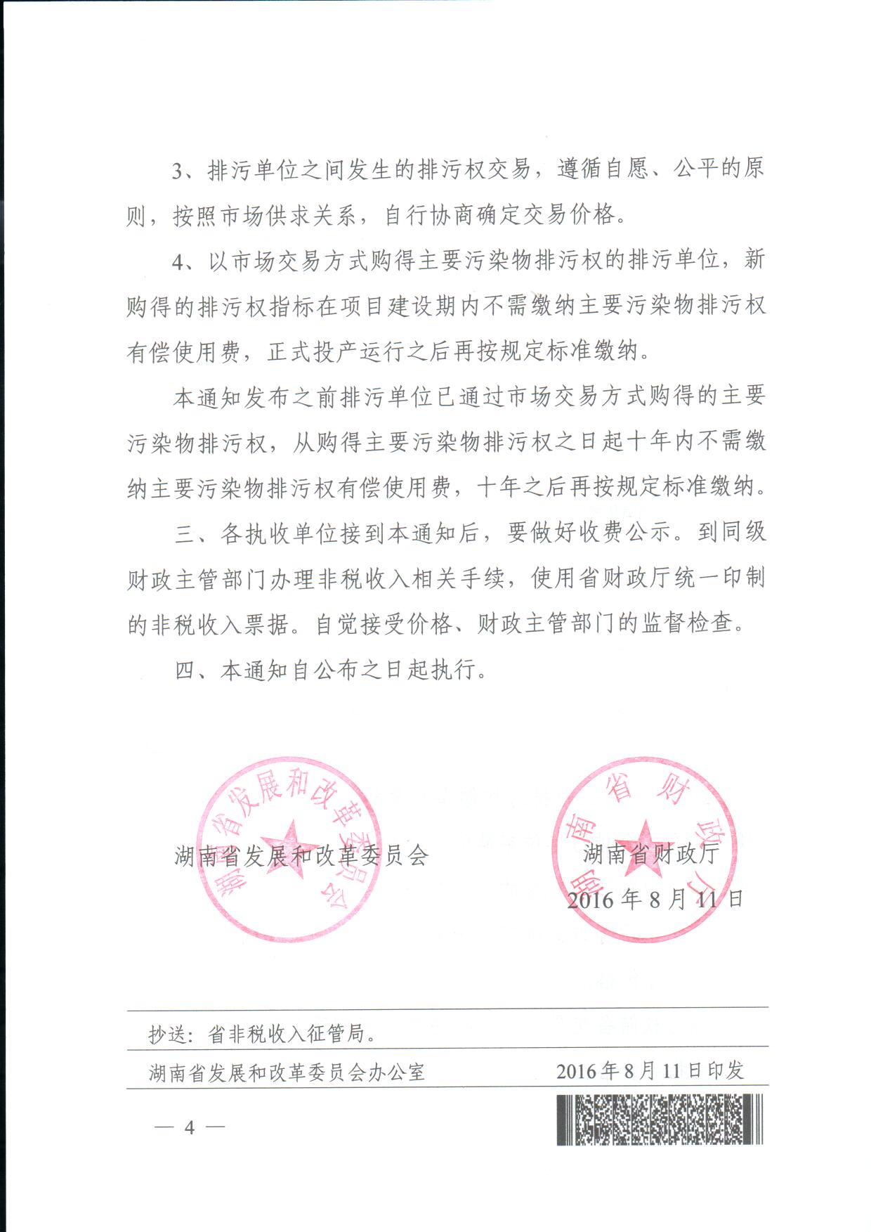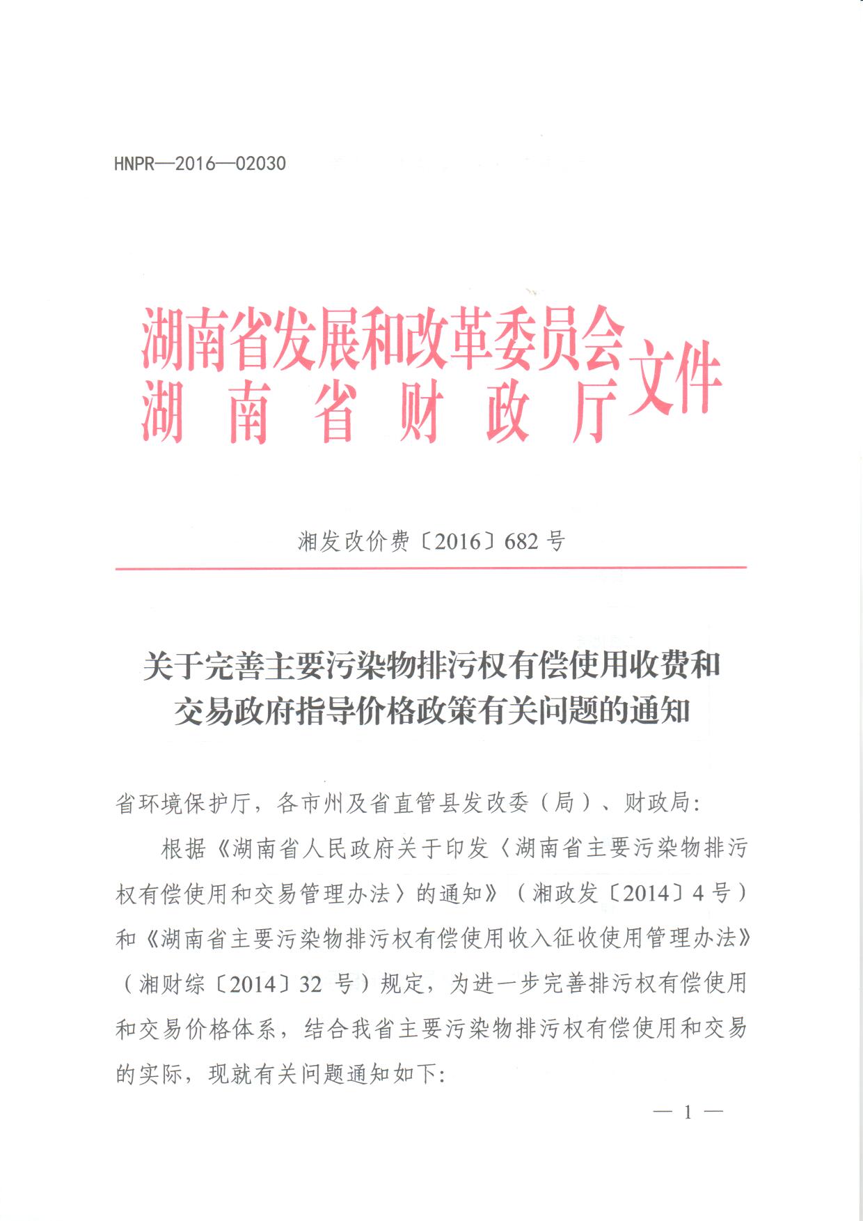 關於完善主要汙染物排汙權有償使用收費和交易政府指導價格政策有關問題的通知(湘發改價費[2016]682號)