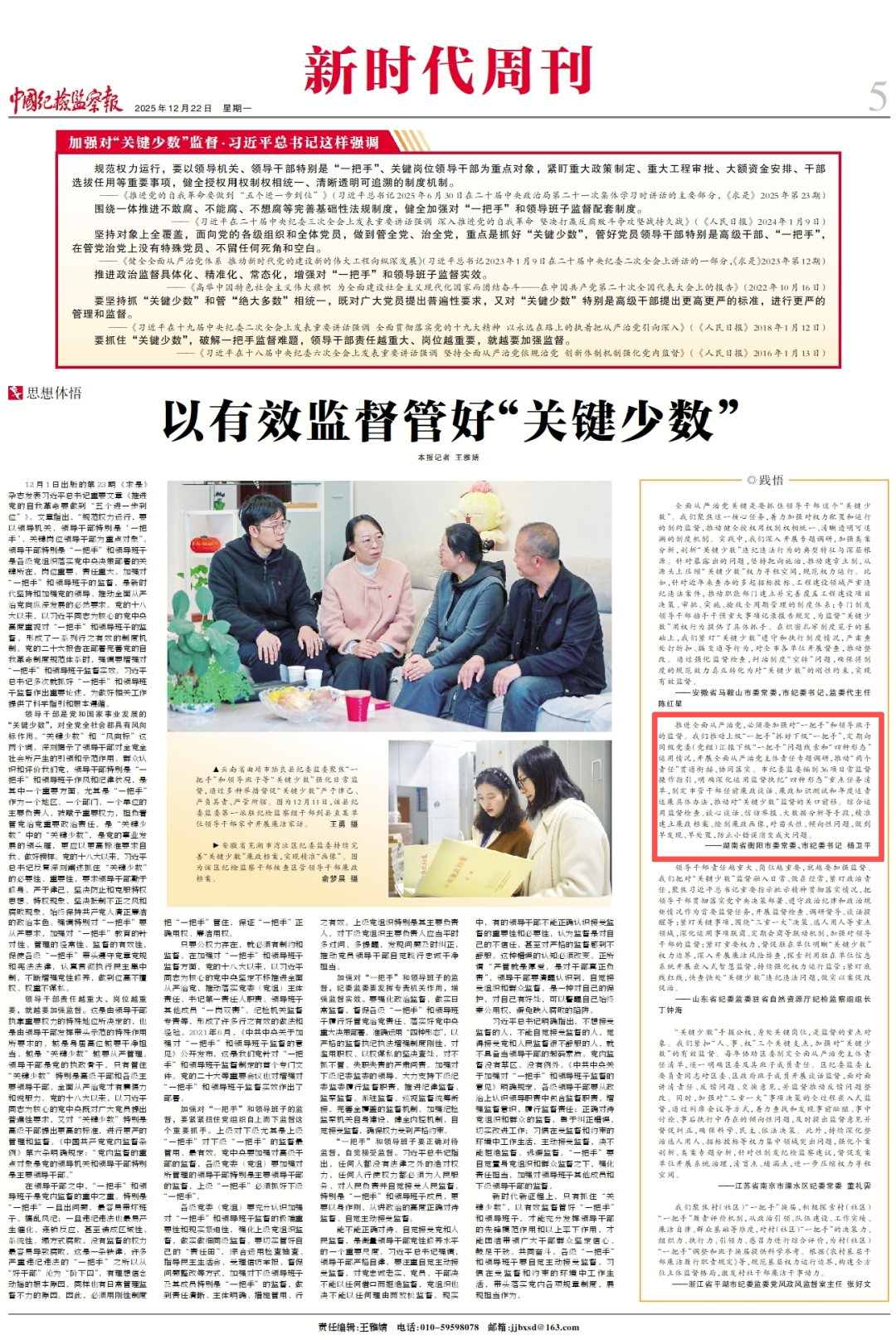 12月22日,《中國紀檢監察報》新時代周刊刊文《以有效監督管好“關鍵少數”》,報道紀檢監察機關深入學習習近平總書記關於加強對“關鍵少數”監督的重要論述,推動理論學習與業務實踐深度融合。市委常委、市紀委書記楊衛平分享實踐體悟。
