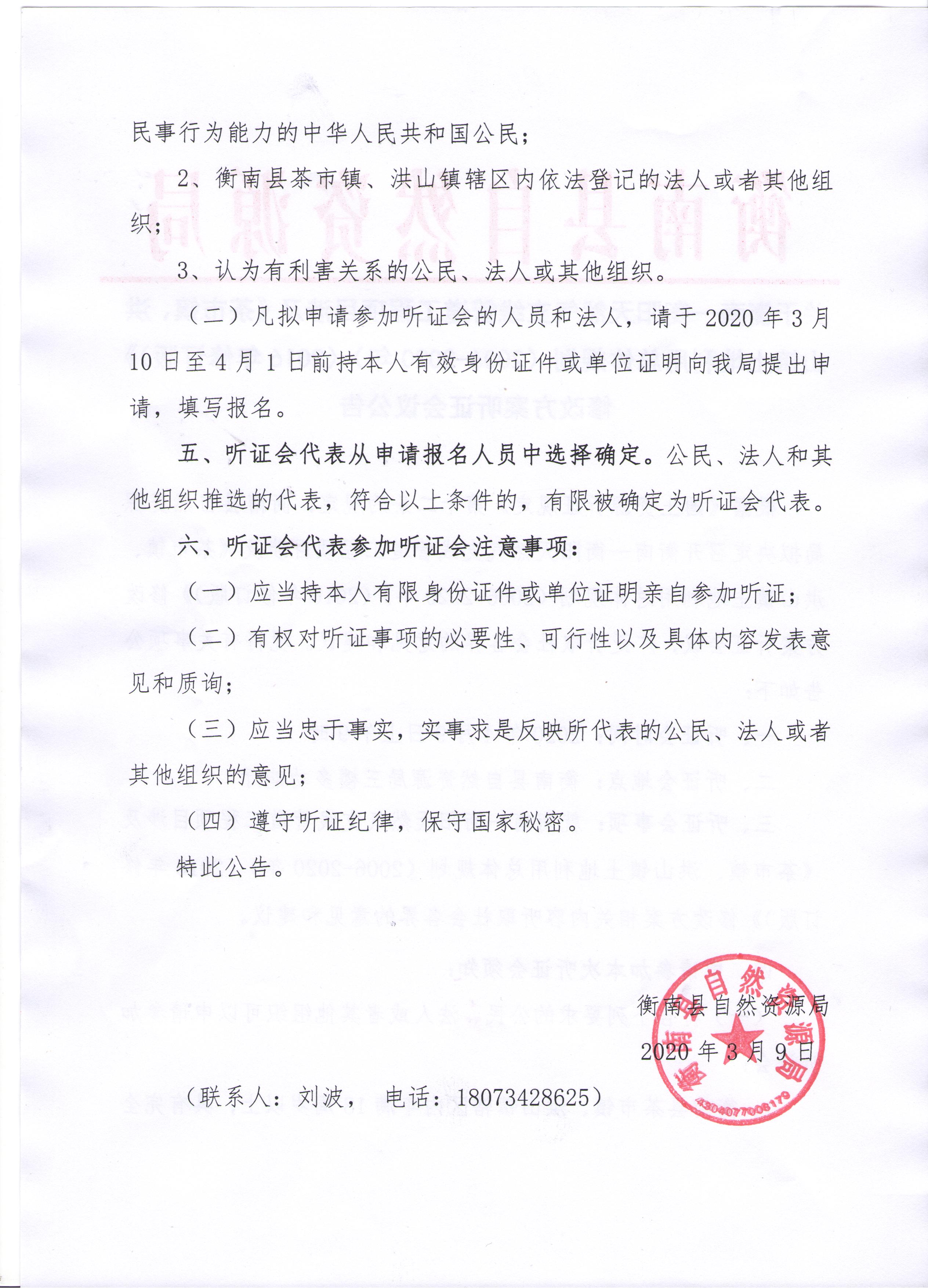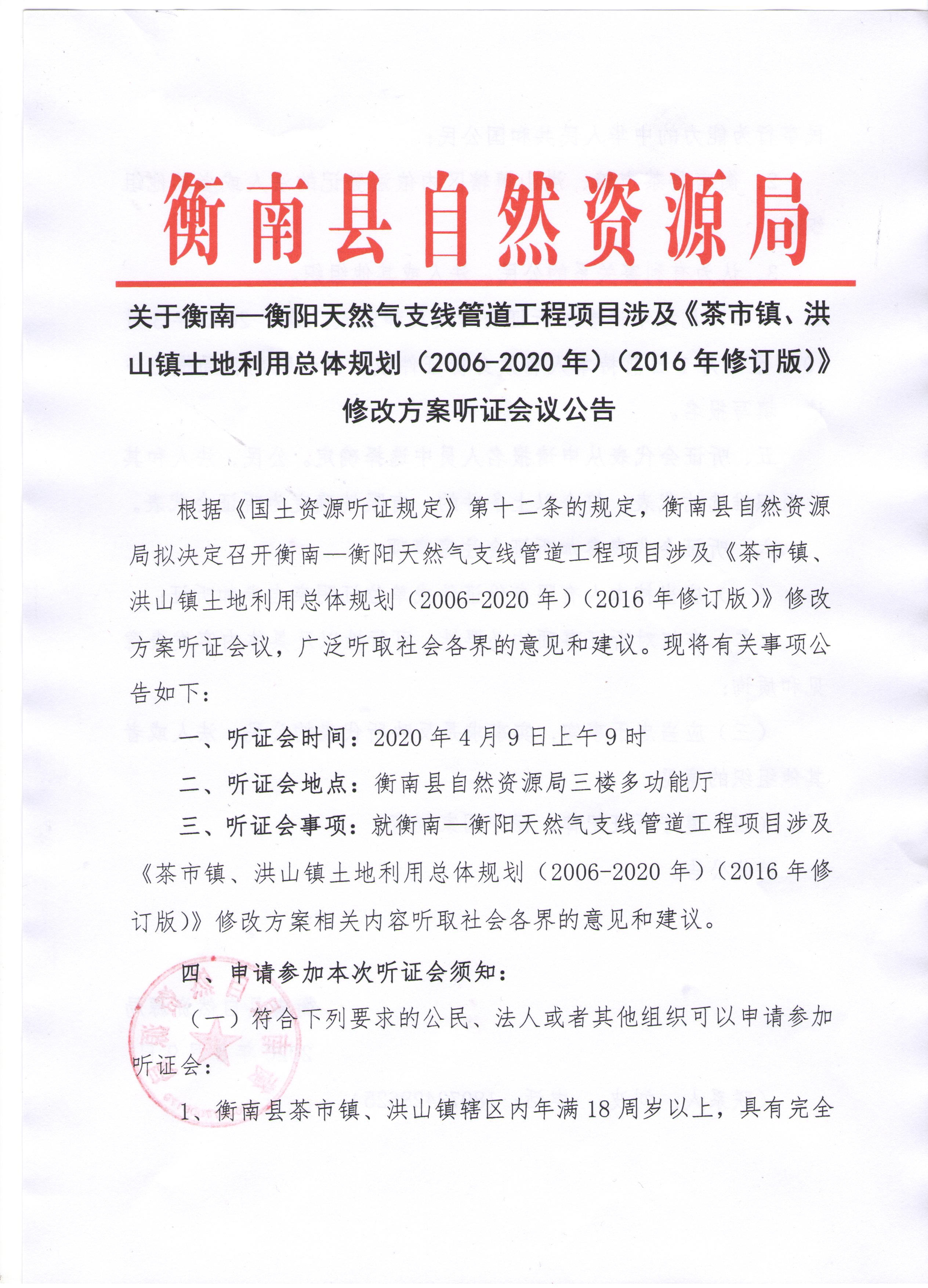 關於衡南-衡陽天然氣支線管道工程項目涉及《茶市鎮、洪山鎮土地利用總體規劃(2006-2020年)(2016年修訂版)》修改方案聽證會議公告