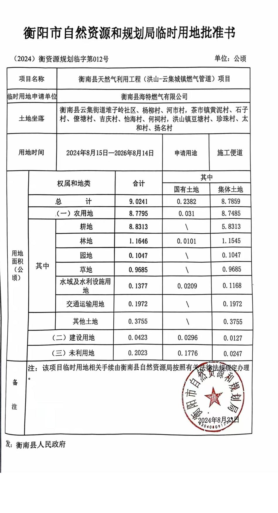 衡陽市自然資源和規劃局臨時用地批準書 (2024)衡資源規劃臨字第012號