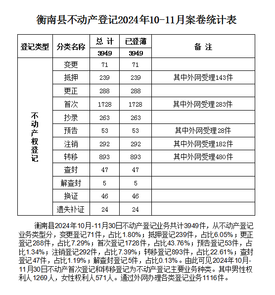 衡南縣不動產登記2024年10-11月案卷統計表