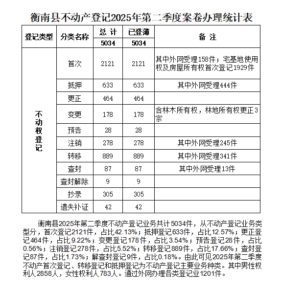 衡南縣不動產登記2025年第二季度案卷辦理統計表