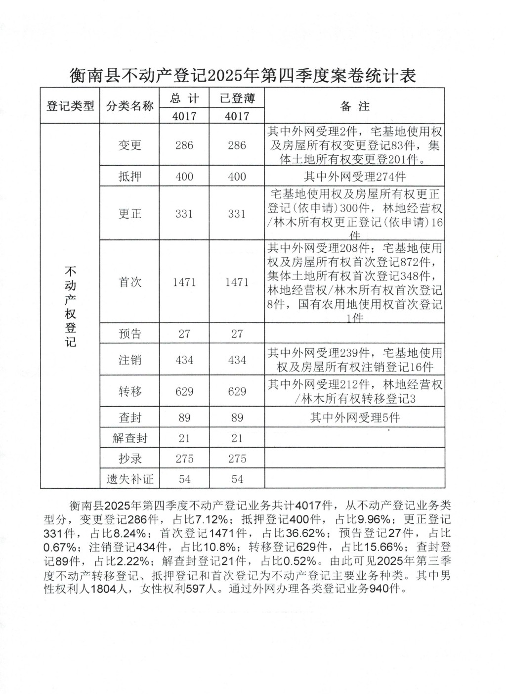 衡南縣不動產登記2025年第四季度案卷統計表