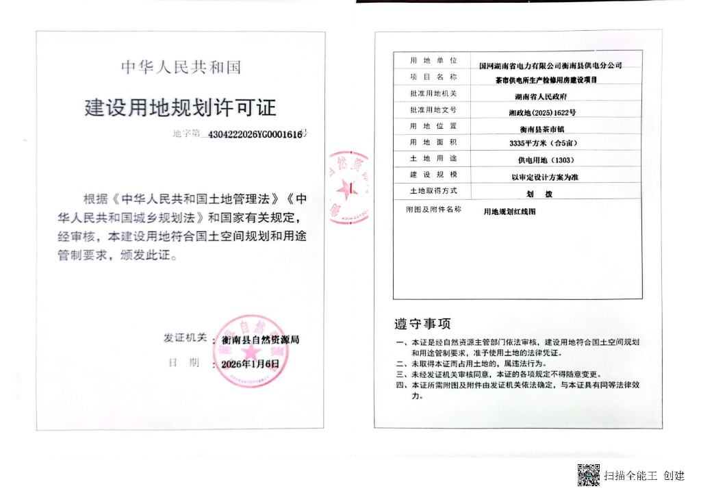 衡南縣建設用地規劃許可證公示(茶市供電所生產檢修用房建設項目)