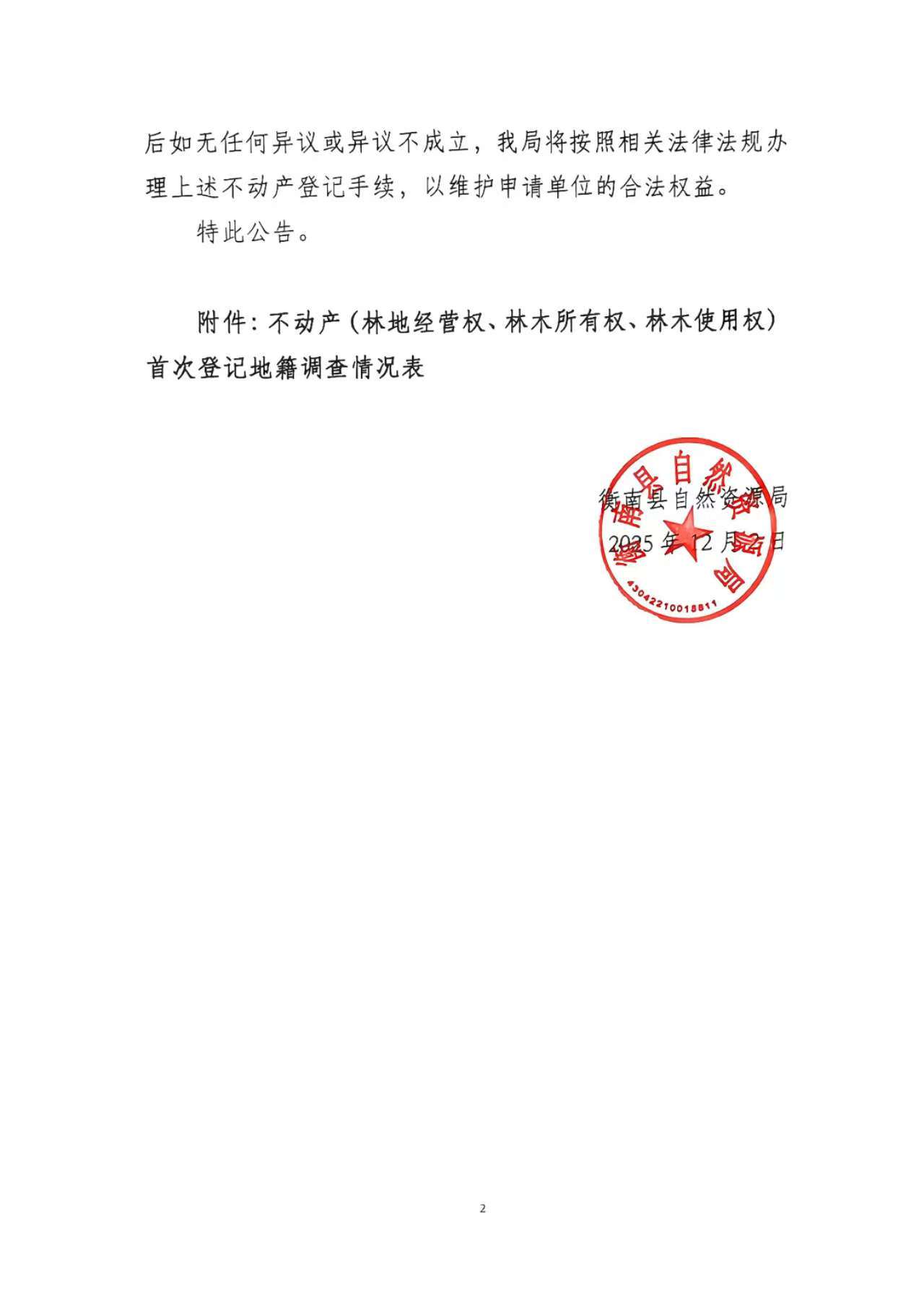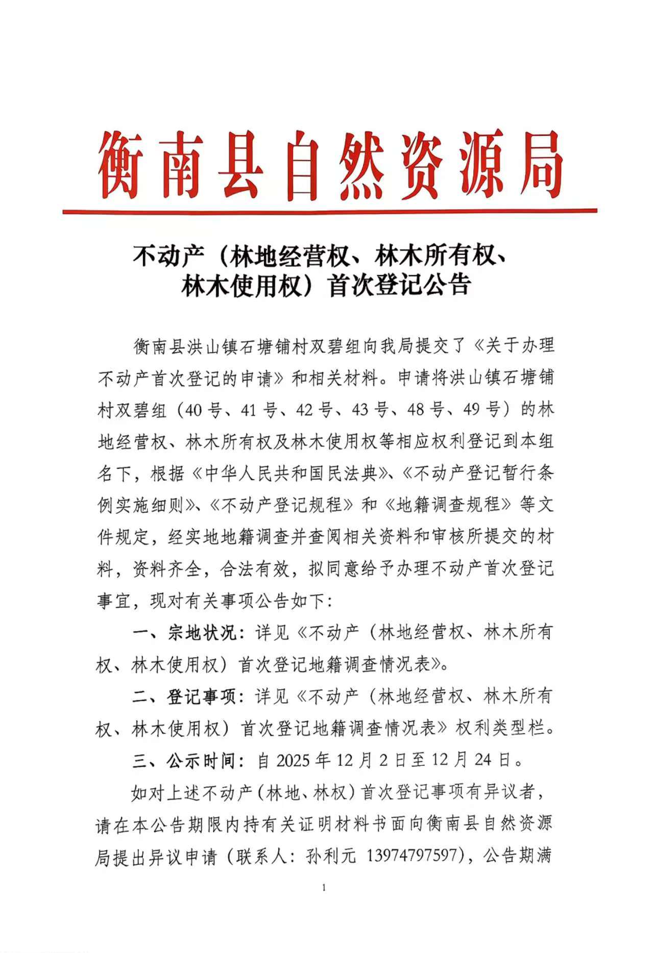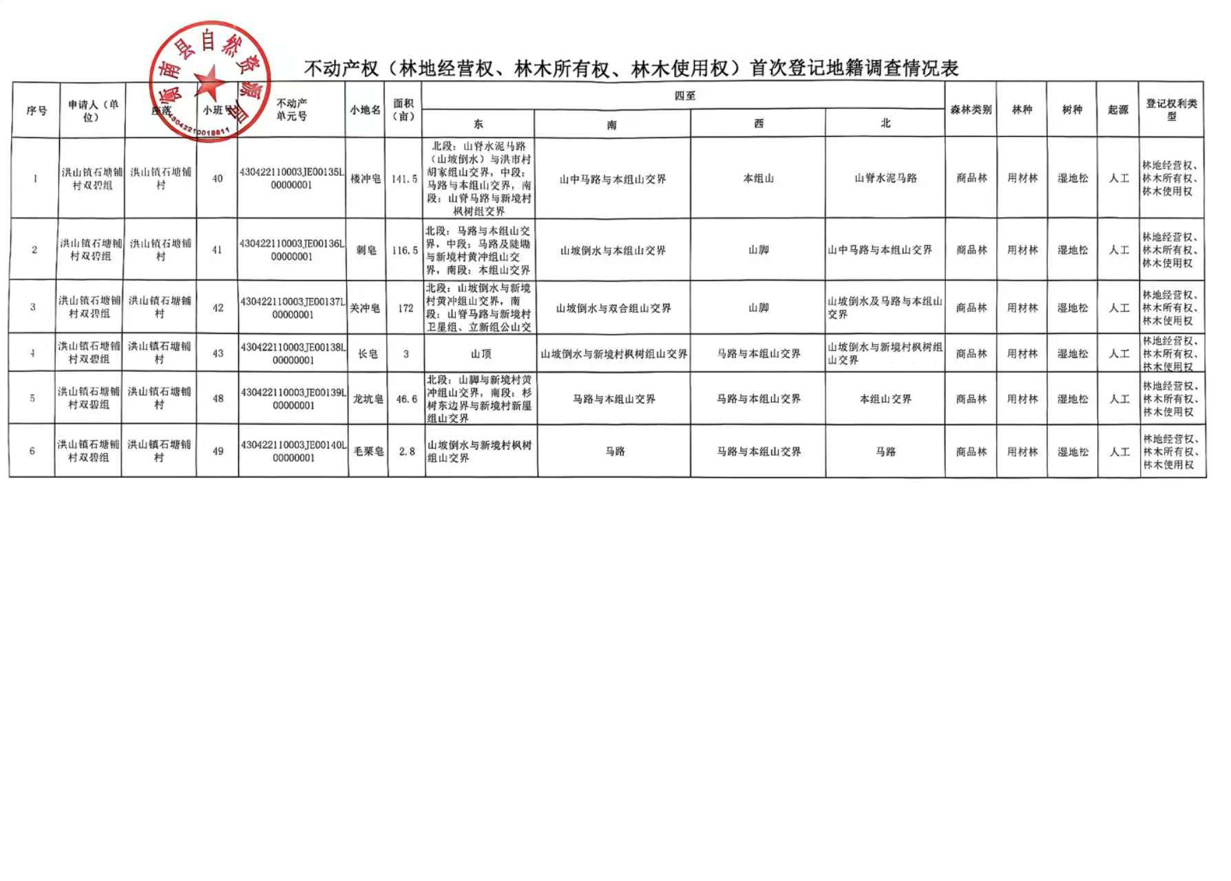 不動產(林地經營權、林木所有權、林木使用權)首次登記公告 (衡南縣洪山鎮石塘鋪村雙碧組)