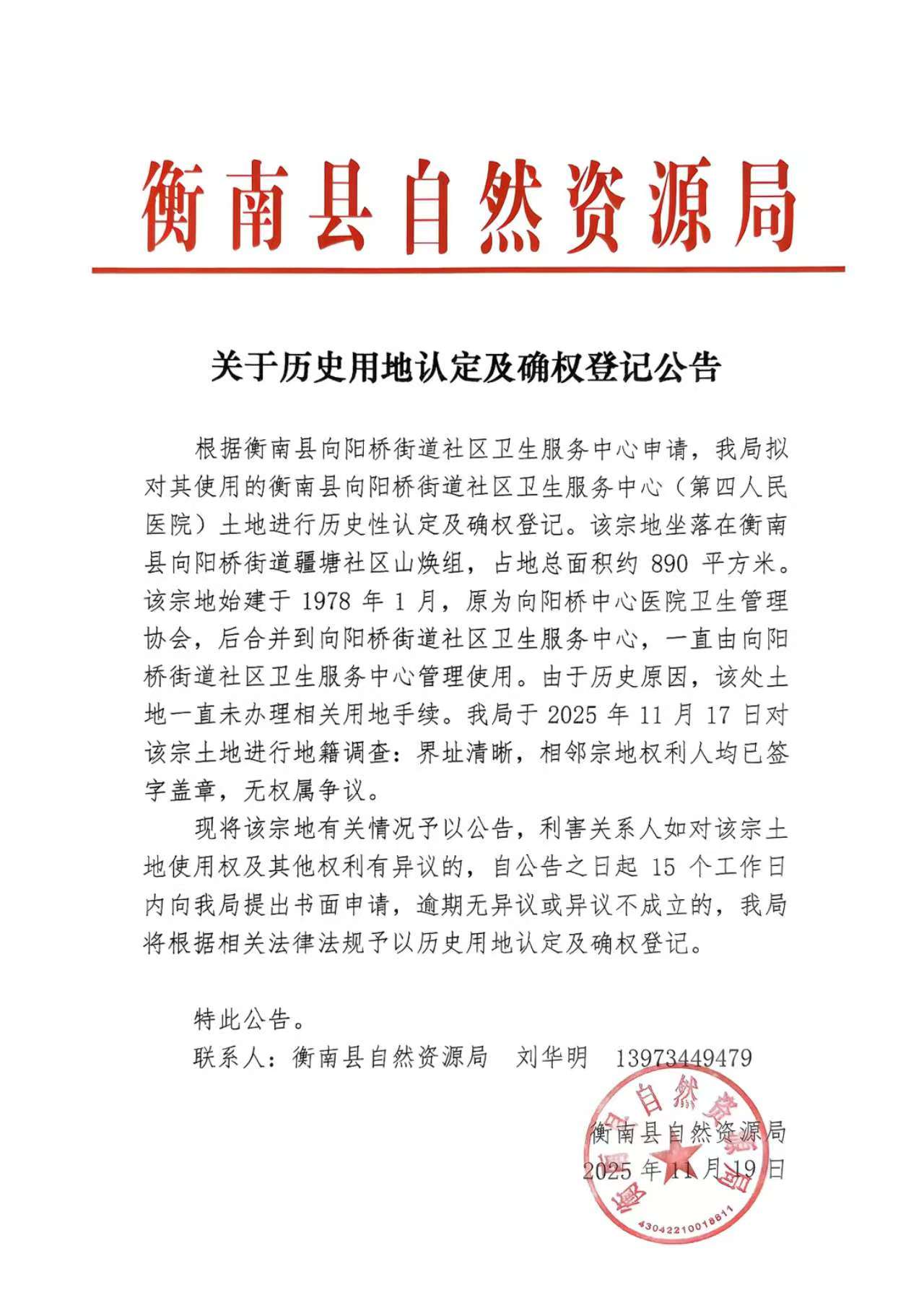 關於曆史用地認定及確權登記公告(衡南縣向陽橋街道社區衛生服務中心【第四人民醫院】)