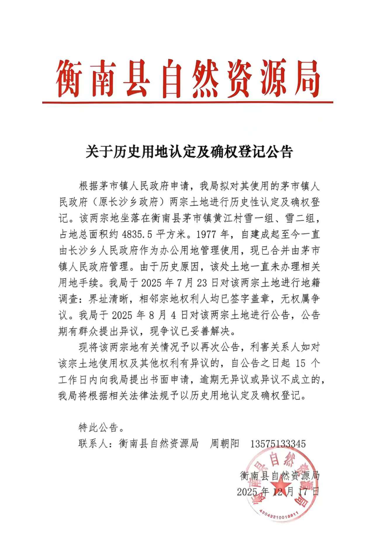 關於曆史用地認定及確權登記公告(茅市鎮人民政府【原長沙鄉政府】)