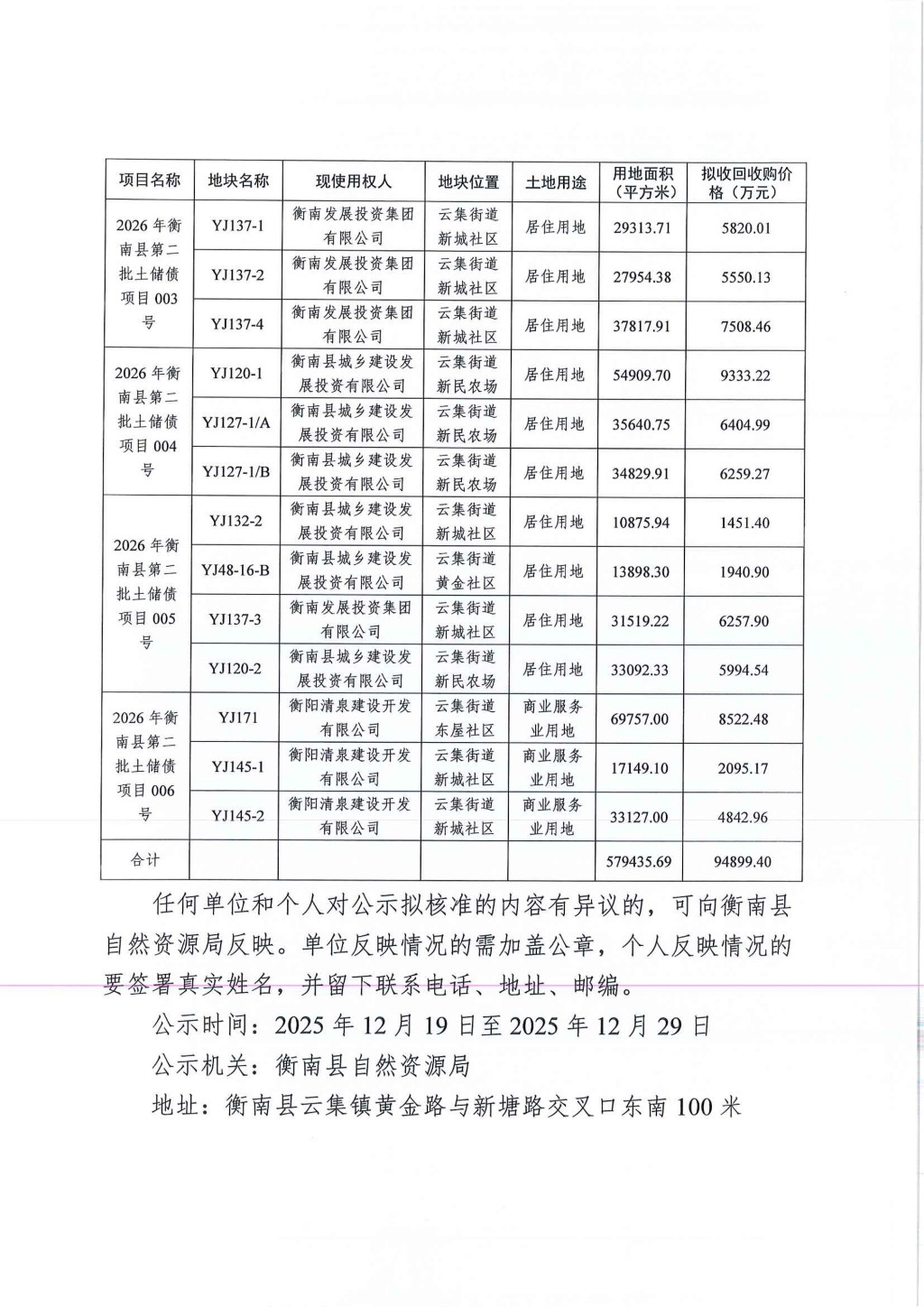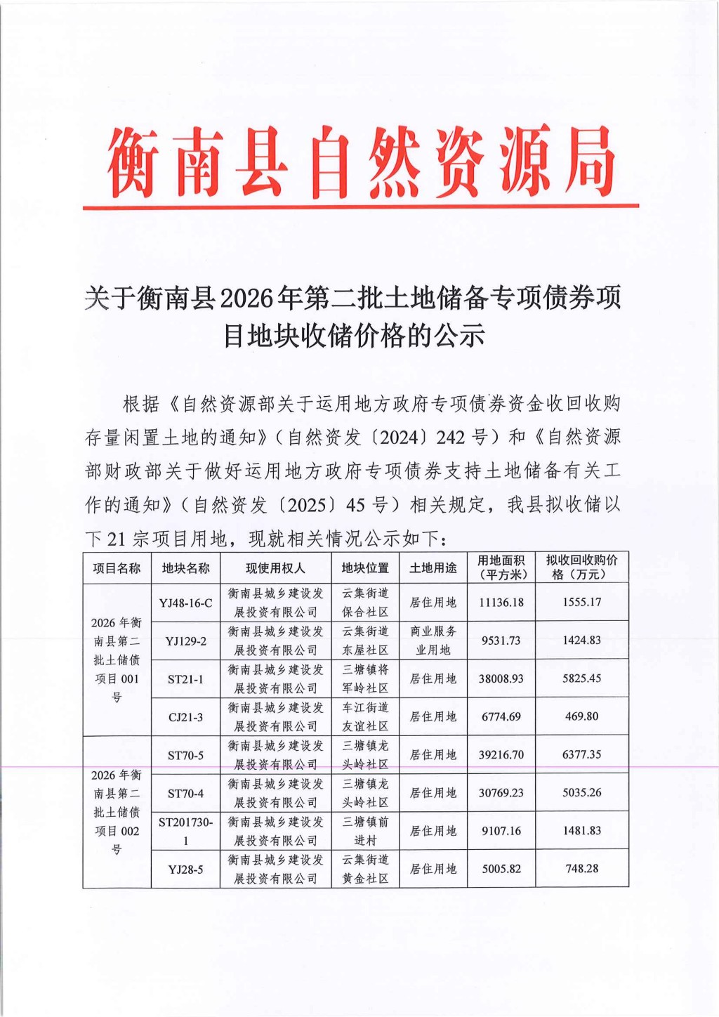 關於衡南縣2026年第二批土地儲備專項債券項目地塊收儲價格的公示
