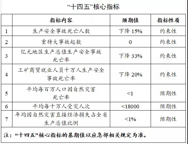 2.“十四五”發展目標。到2025年,形成統一指揮、專常兼備、反應靈敏、上下聯動的應急管理體製,建成統一領導、權責一致、權威高效的應急能力體係,建立公共安全隱患排查和安全預防控製體係。牢牢守住安全生產底線,堅決杜絕重特大事故,堅決遏製較大事故,堅決防範自然災害導致重大人員傷亡,確保安全生產事故總量持續下降,確保全省安全形勢持續穩定向好,自然災害防禦水平明顯提升。體現應急管理職業特點的隊伍管理製度、人才培養製度和政策保障體係基本健全,應急管理法治水平和科技信息化水平大幅提升,全社會防範應對災害事故能力顯著提升。