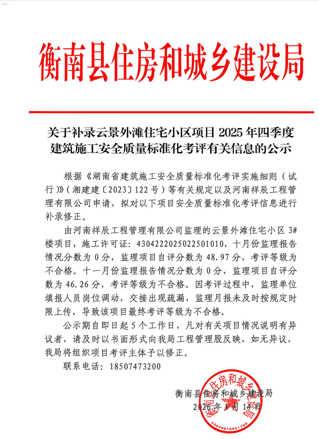 關於補錄雲景外灘住宅小區項目2025年四季度建築施工安全質量標準化考評有關信息的公示