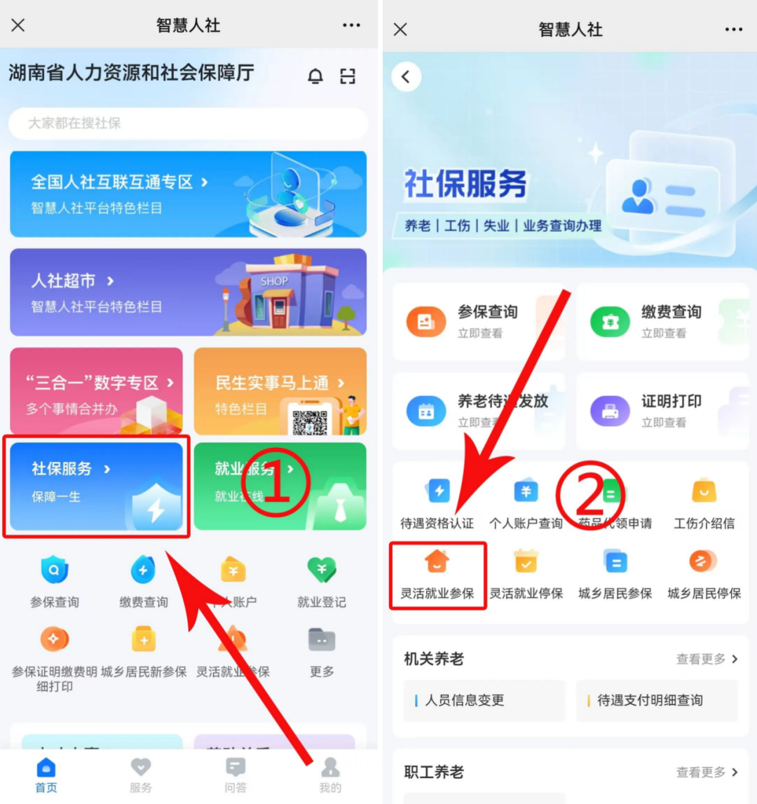 手機下載"智慧人社"APP——實名製注冊及登錄"智慧人社"APP——首頁點擊"社保服務"模塊——選擇"靈活就業參保"(所屬區域根據自己戶籍所在地或常住地填選)——申請參保。