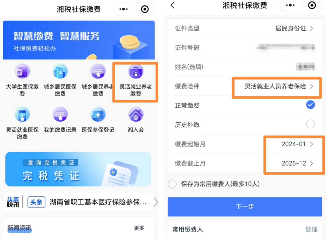 登錄"湘稅社保"APP或小程序,選擇"靈活就業養老繳費"模塊,選擇"靈活就業人員養老保險",如實填寫相關信息(如身份證號、姓名)完成費用繳納。