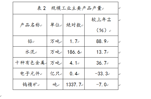 全縣完成規模以上工業總產值179.8億元,規模以上工業實現增加值44.6億元,增長5.4%實現主營業務收入175億元,實現利潤10.99億元,產品產銷率99.8%。規模工業主要產品產量見表2