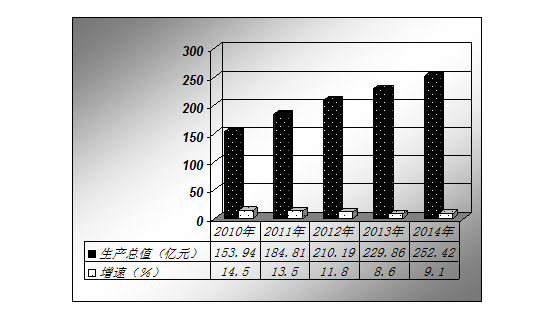 初步核算全年完成生產總值(GDP)252.42億元,增長9.1%。其中第一產業實現增加值59.93億元,增長4.5%;第二產業實現增加值123.27億元,增長8.9%,第三產業實現增加值69.23億元,增長13.5%。