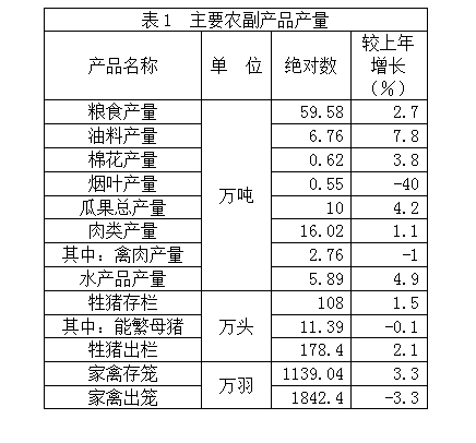 全縣完成農業總產值96.62億元,增長4.5%, 全縣實有耕地麵積65.76千公頃,與上年持平,其中水田57.67千公頃;全年完成糧食播種麵積108.37千公頃,增長 2.1%,其中穀物種植麵積100.86千公頃,增長1.8%;油料種植麵積41.93千公頃,增長4.8%;棉花種植麵積4.56千公頃,增長8.3%;煙葉種植麵積1.94千公頃,下降42.3%。主要農產品產量見下表1。