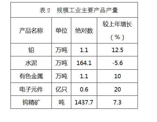 全縣完成工業總產值245.15億元,其中規模以上工業實現總產值208.71億元。全部工業實現增加值96.54億元,其中規模以上工業實現增加值57.31億元,增長9.4%;實現主營業務收入102.62億元,實現利潤3.71億元,產品產銷率100.09%。規模工業主要產品產量見表2。