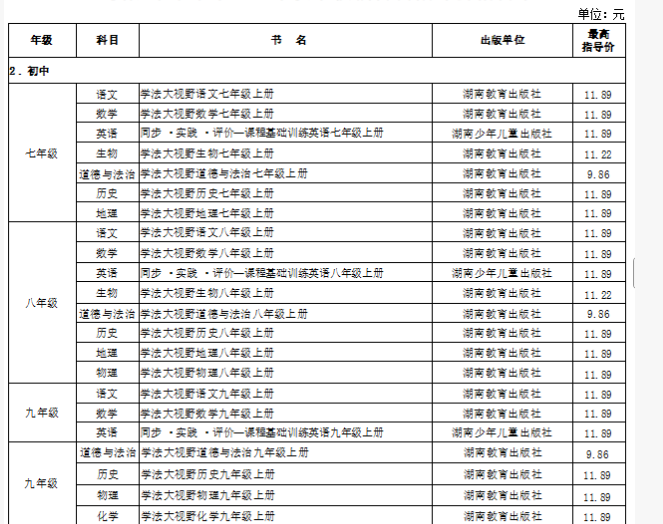 小學三至六年級同步練習冊,如湖南教育出版社《學法大視野》語文、數學,最高指導價均為11.89元,湖南少年兒童出版社《同步·實踐·評價》英語、科學等均為10.54元;