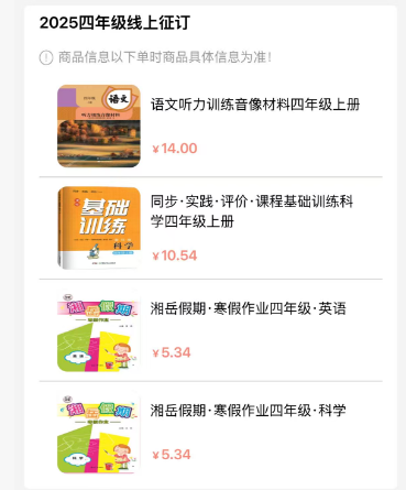 記者采訪發現,多名家長均按自願原則通過"線上"購買教輔材料。其中,一名小學四年級家長購買了語文聽力訓練音像材料、科學同步練習、英語及科學寒假作業,分別為14元、10.54元、5.34元、5.34元,價格均未超過《通知》規定的最高限價。