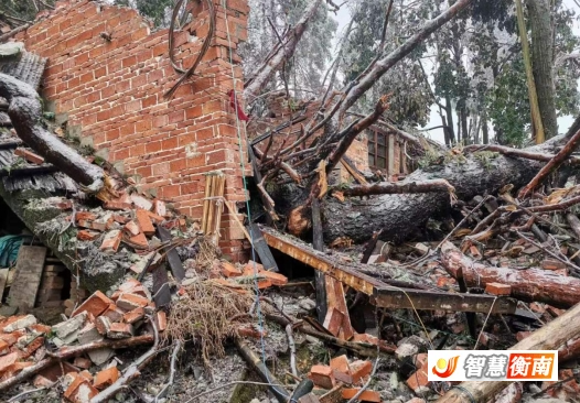 2月7日,衡南縣岐山鎮芳衝村高興小組發生因冰雪天氣大樹結冰負重壓垮房屋事件,由於事先已成功轉移村民,未造成人員傷亡。
