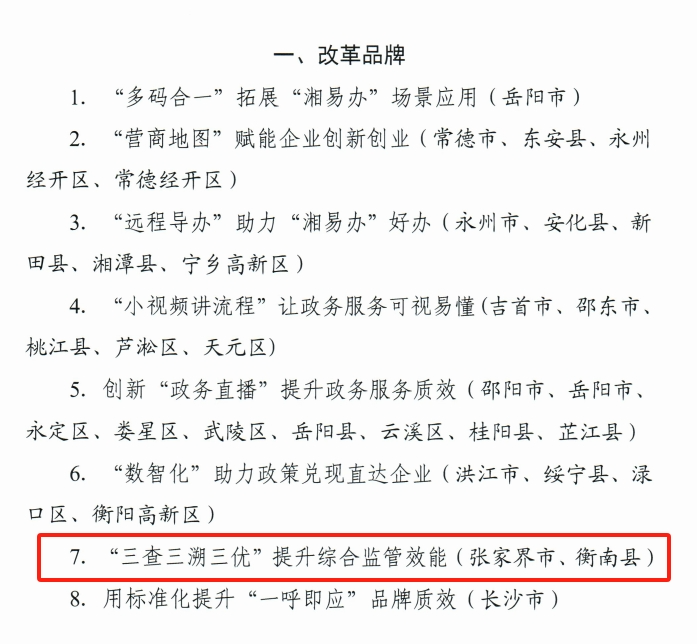 近日,湖南省數據局印發《關於2023年政務服務改革"揭榜競優"典型經驗的通報》,衡南縣"三查三溯三優"提升綜合監管效能改革品牌獲推介!