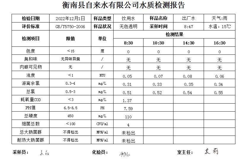 衡南縣自來水公司2022年12月份水質檢測報告